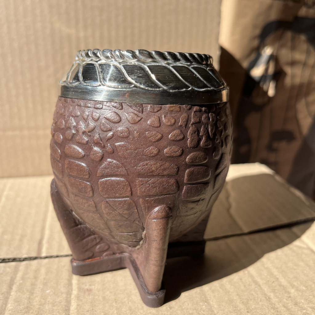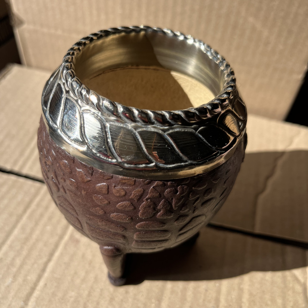 Uruguayi stílusú lopótök bőrrel borítva, Alpaca ezüstből, azaz újezüstből készült, nagyon vastag falakkal.