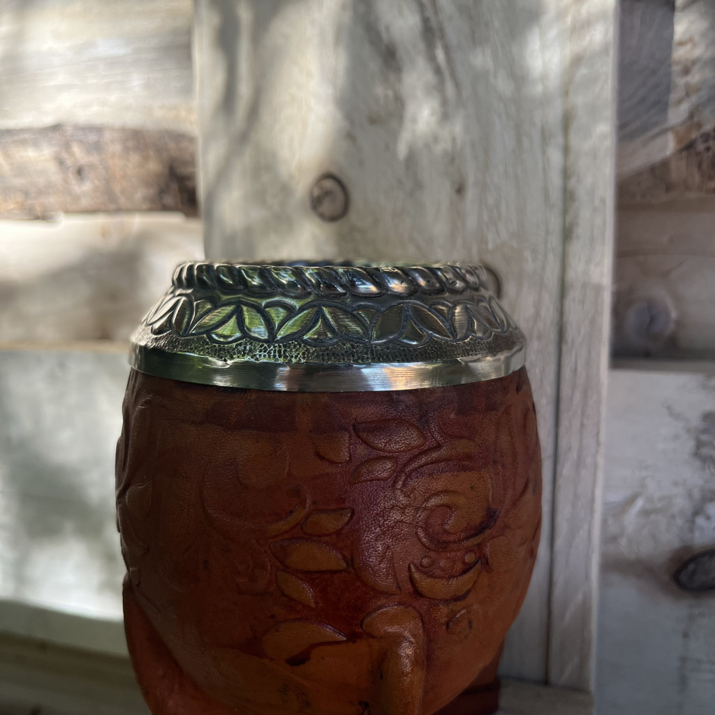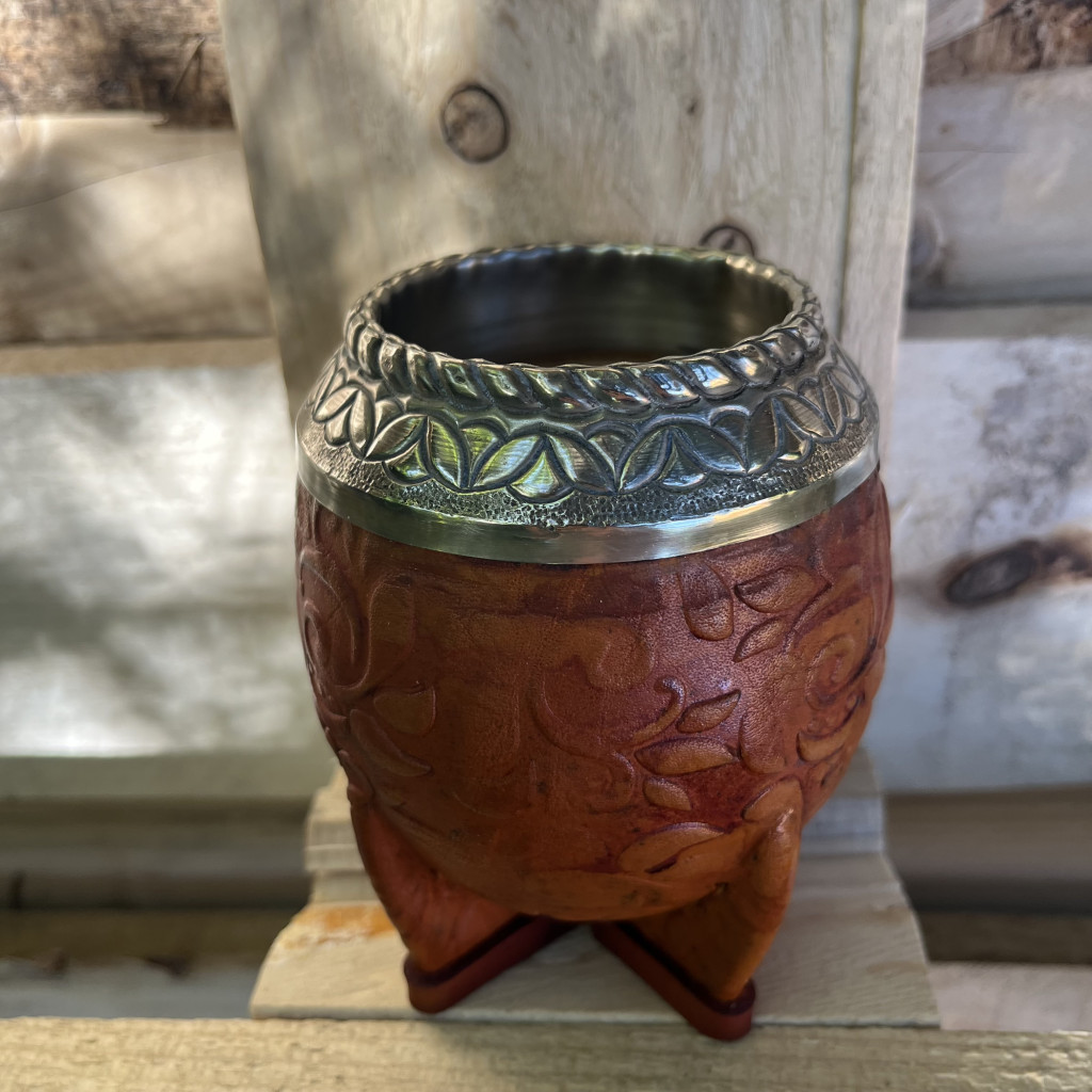 Uruguayi stílusú lopótök bőrrel borítva, Alpaca ezüstből, azaz újezüstből készült, nagyon vastag falakkal.