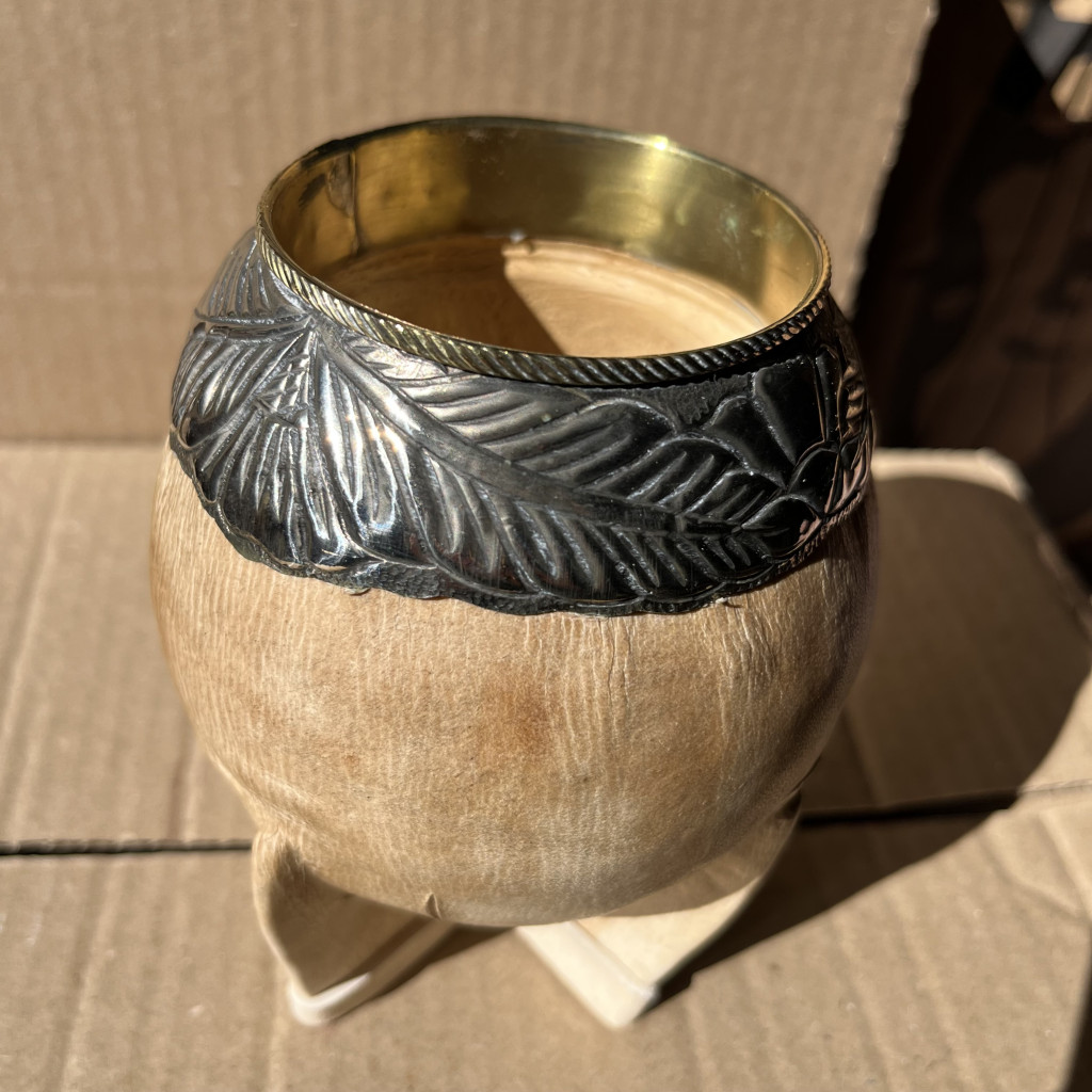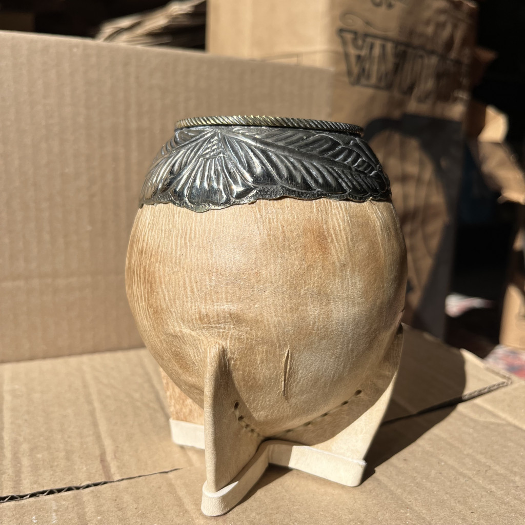 Uruguayi stílusú lopótök bőrrel borítva, Alpaca ezüstből, azaz újezüstből készült, nagyon vastag falakkal.